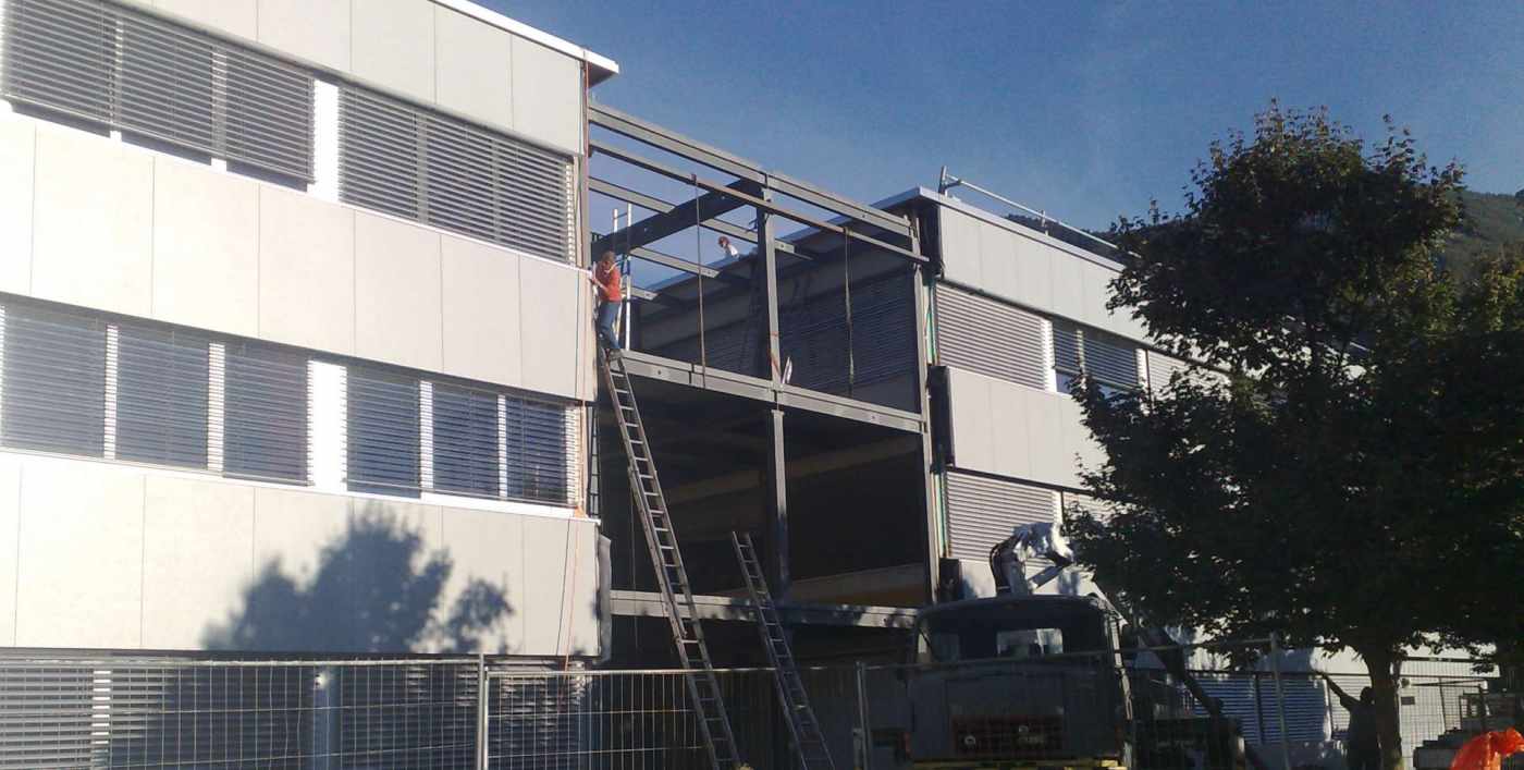 Edificazione di un nuovo corpo aule in carpenteria metallica tra due edifici esistenti.