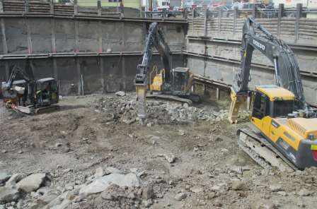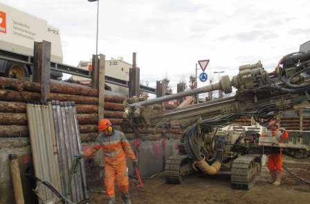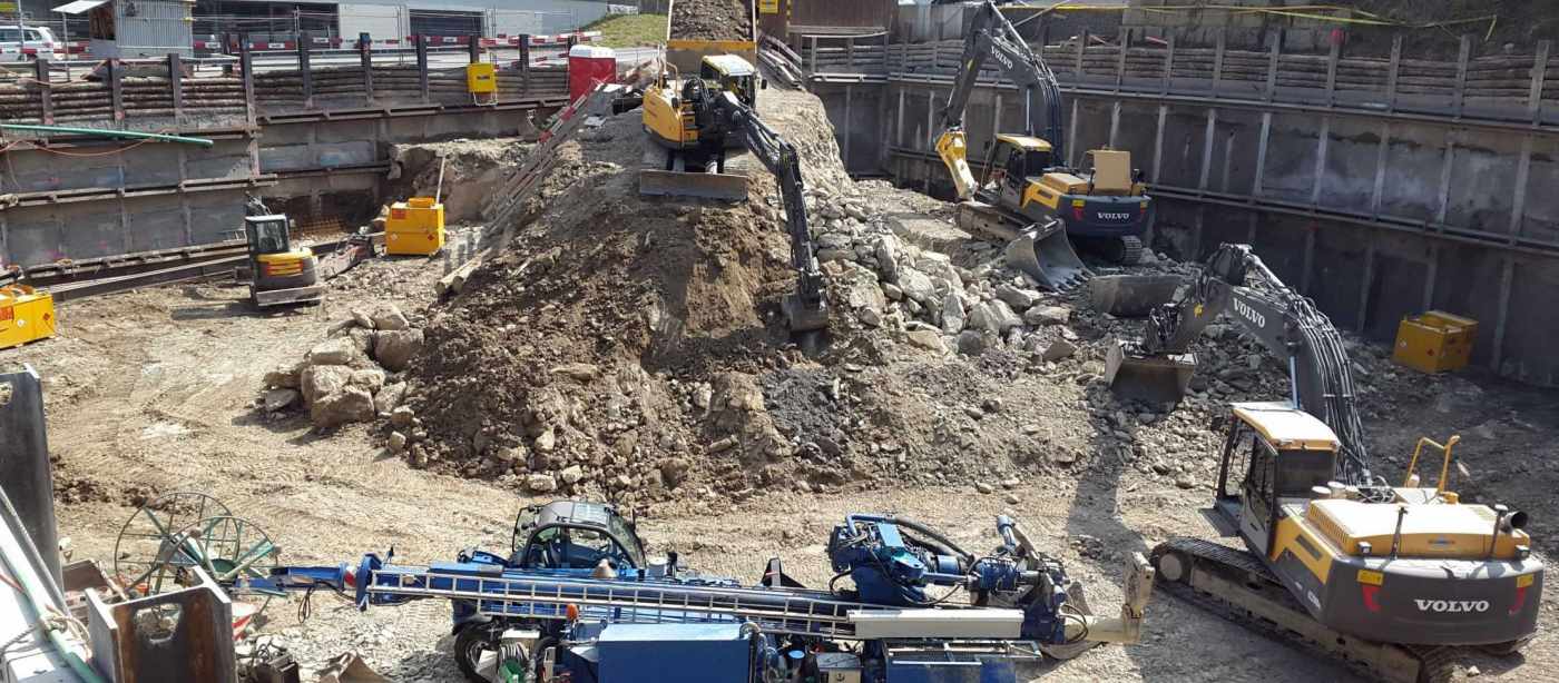 Da die Platzverhältnisse beschränkt sind, wird für die gesamte Baugrube ein senkrechter Baugrubenabschluss vorgesehen. Zur Anwendung kommt eine gebohrte, rückverankerte Rühlwand. Aufgrund des von Südwest nach Nordost stark abfallenden Molassefelses werden im Bereich der Churerstrasse (Kantonsstrasse) sowie in einem Teilbereich der Huobstrasse mehrere Ankerlagen benötigt.