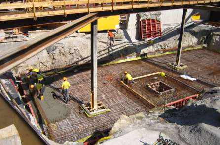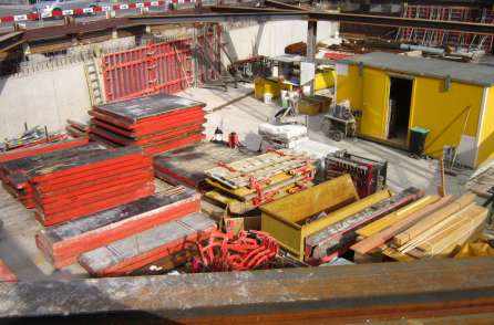 Gewerbehaus auf Tiefgarage Keller im zweiten Untergeschoss Fassade mit Sichtbetonelementen Baugrube mit gegenseitig abgespriesster Rühlwand Fundation auf Fels, zum Teil mit Tatzen, respektive Grossbohrpfählen