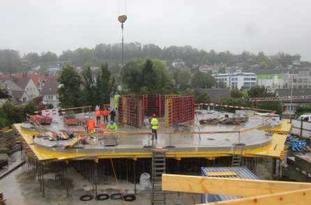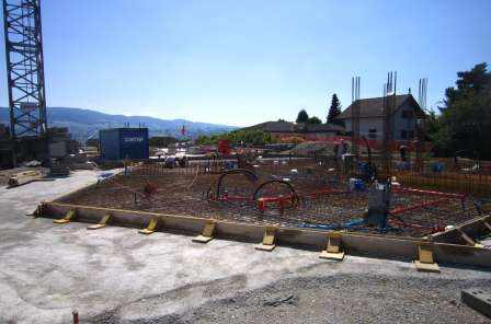 Die Baugrube wurde frei geböscht. Die Gebäude konnten flach im Molassefels fundiert werden. Zur Entwässerung der "Badewanne" im Fels mussten Gräben der Kanalisation tiefer gespitzt werden.