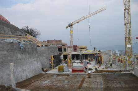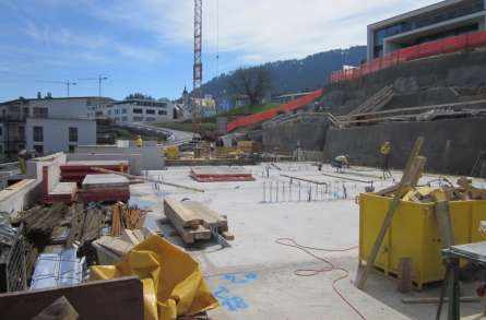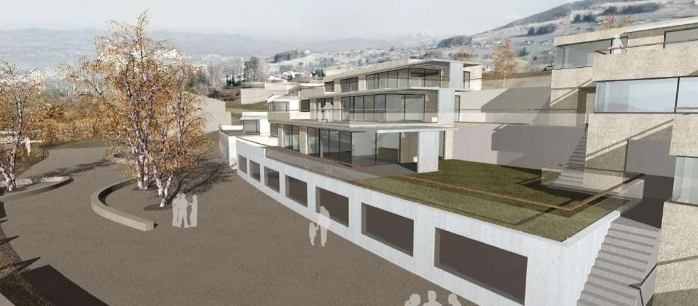 Hochbau: Beim vorliegenden Bauobjekt handelt sich um den Neubau von 5 Terrassenhäusern in Massivbau, bestehend aus einer Sammelgarage, je zwei Obergeschossen, sowie je einem Attikageschoss. Die Grundrissabmessung der Ebene 0 (Sammelgarage) beträgt zirka 17 m x 126 m. Die Grundrissabmessungen der Ebenen 1 bis 3 betragen zirka 15 m x 23 m. Die horizontalen Tragelemente bestehen aus schlaff bewehrten Stahlbetondecken, die vertikalen Tragelemente aus Stahlbeton- und Mauerwerkswänden sowie vorfabrizierten Stahlbeton- und Stahlstützen. Das Bauwerk wird als Wohnhaus genutzt. Baugrube: Infolge der engen Platzverhältnisse und der schlechten geologischen Baugrundverhältnisse mussten die Böschungen mit vernagelter Spritzbetonwand gesichert werden. Die Gebäudelasten wurden konsequent, wo nötig mittels Geröllbetonriegel, in die Moräne abgeleitet.