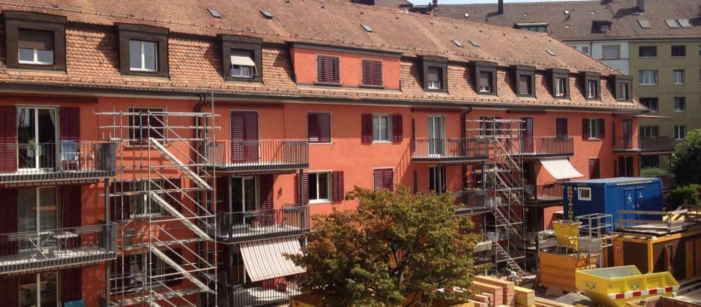 Küchen und Bäder wurden komplett ersetzt. Aufgrund der Grundrissanpassungen mussten die Hurdisdecken mit Stahljochen und Betonstürzen abgefangen werden. Die bestehenden Balkone wurden abgerissen und durch Grössere in Ortbeton ersetzt.